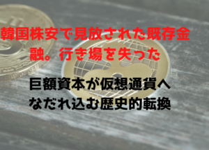 韓国株の大暴落が引き金か、伝統的金融から暗号資産へ資金がなだれ込む異常事態の真相は、既存の枠組みの崩壊を物語っています。